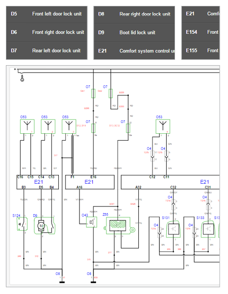• Wiring diagrams covering e.g. door locks, windows, airbags, exterior lights, starting/charging and wash/wiper systems